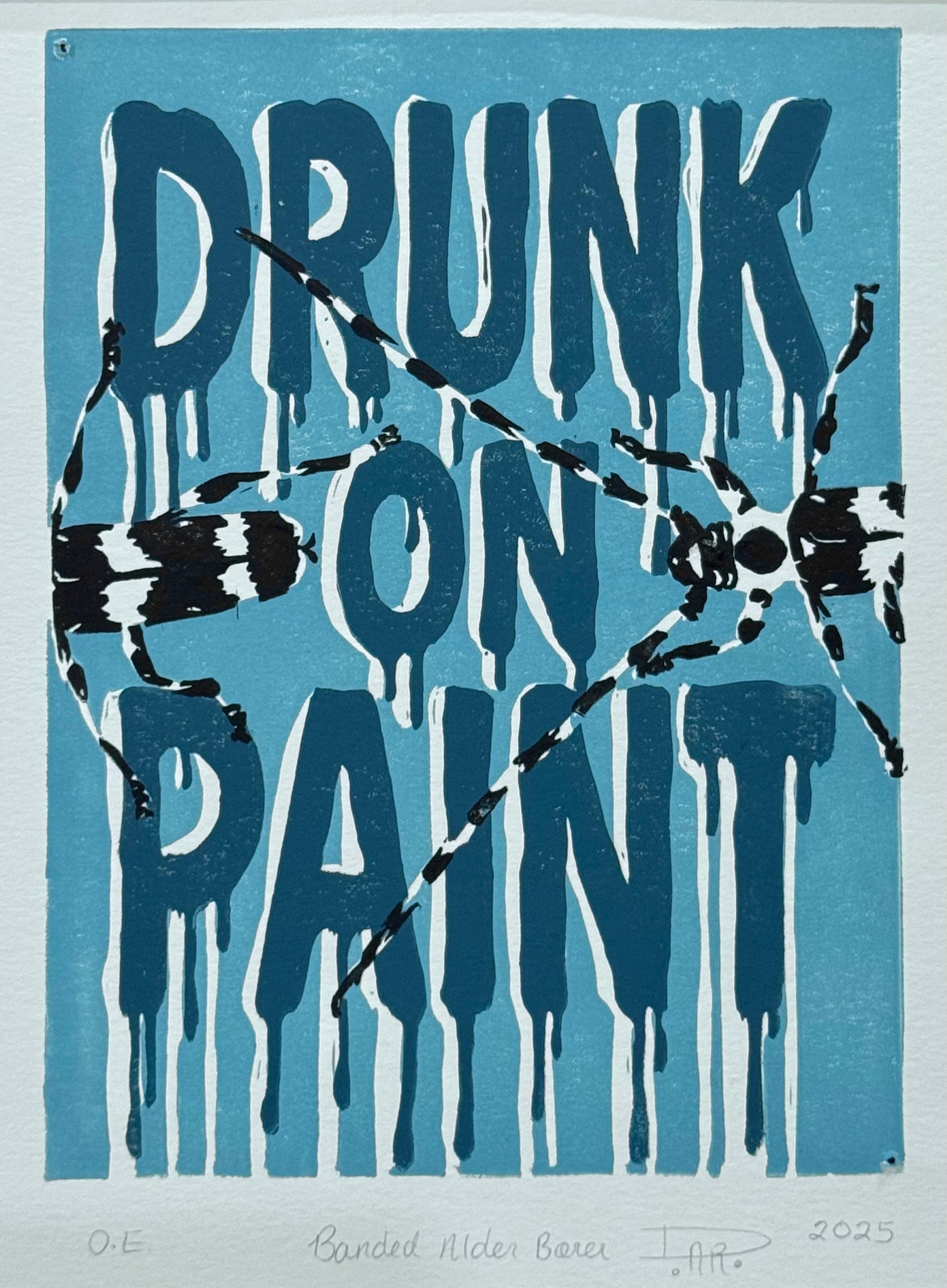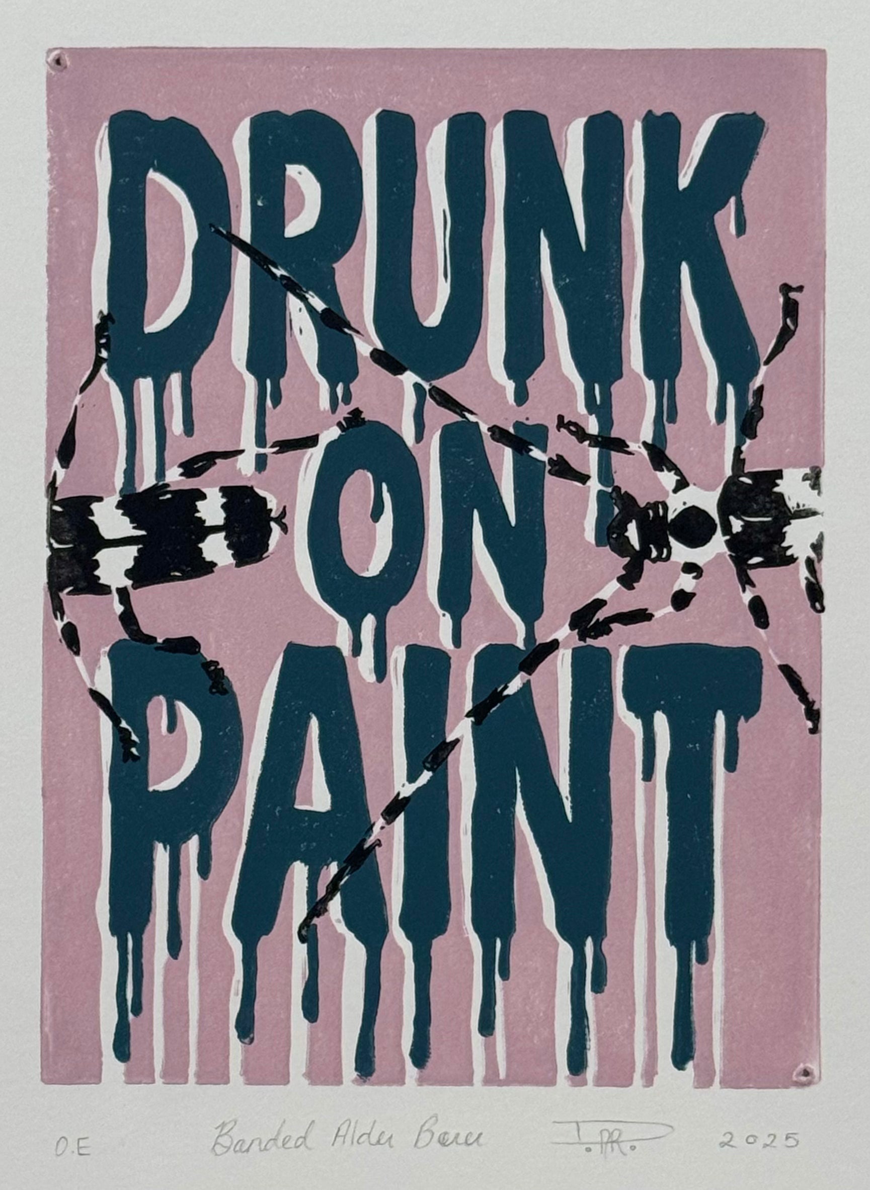 Native to the West Coast of Canada, the banded alder borer is drawn to the scent of fresh paint because its chemical notes mimic the smell of newly fallen wood, the ideal surface for laying eggs. I first encountered one in Victoria, BC, standing out against freshly painted white pavement, so striking that I genuinely believed it had escaped from the Bug Zoo. When I called to report it, I learned that they are in fact native to the region and that people regularly mistake them for exotic insects and bring them into the zoo. What reads as intoxication is in reality instinct, a reproductive pull disguised as desire. In this print, the dripping letters blur the line between attraction and compulsion, humour and biology. The phrase becomes both literal and metaphorical, a reflection on how something that appears accidental, even foolish, is often guided by the most ancient and persistent urges.