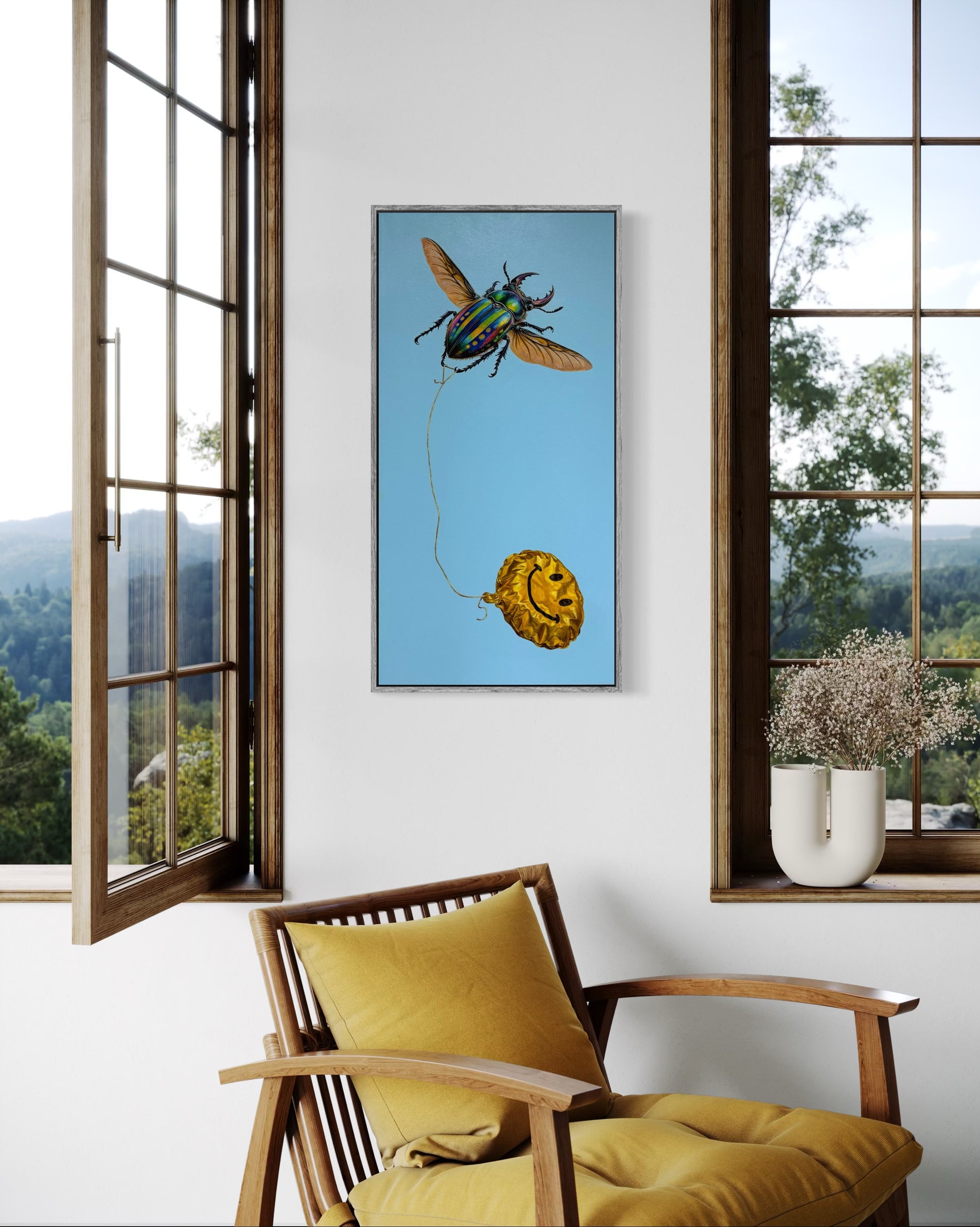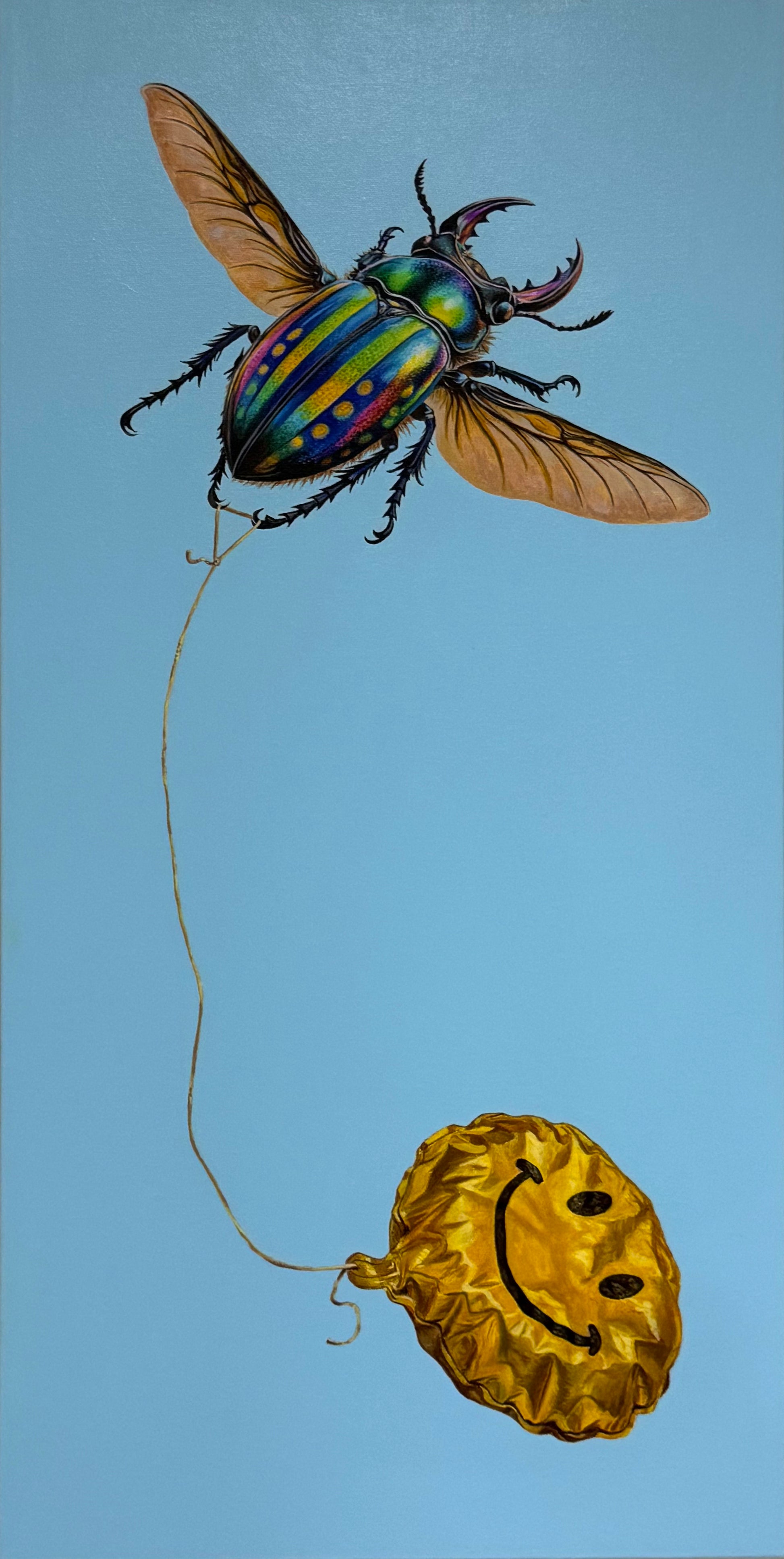 A stag beetle pulls a half-inflated smile balloon through the air. Once driven by the chase of happiness, it is now learning how to hold it. What began as pursuit slowly shifts into possession; something steadier and less fleeting. The work explores our dependence on happiness as a force that once ruled and exhausted us, yet, with time, becomes something we learn to carry differently. By giving this struggle to a creature we assume feels nothing, the piece reflects how deeply human that longing truly is.