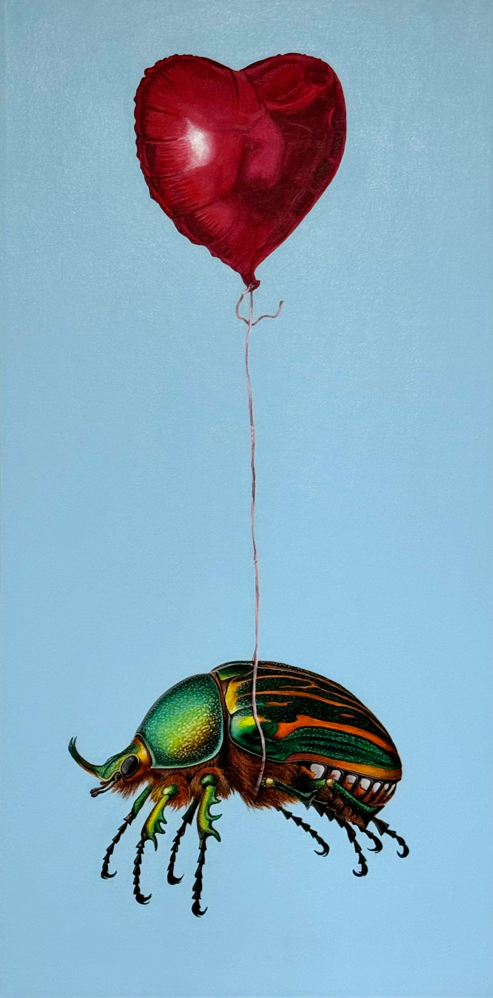 A Japanese beetle floats skyward, suspended, not by its own wings, but by a fragile heart-shaped balloon. The piece speaks to the way love can make us feel weightless. It can lift us beyond our own sense of gravity and carry us somewhere unfamiliar and bright. The beetle, a creature we rarely associate with tenderness, becomes a vessel for that strange and undeniable truth that love often arrives as something both delicate and powerful. It holds us up even when we are unsure how to fly on our own.